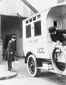 Although the MAB was legally supposed to be transporting only infectious patients, it increasingly also carried accident victims and emergency medical cases. The Metropolitan Ambulance Act, 1909, empowered the London County Council to establish an emergency ambulance service, but this was not established until February 1915 and was under the control of the chief of the London Fire Brigade.[6] Also in 1915, the MAB Ambulance Section were the first public body to employ women drivers, due to the number of men who had volunteered for military service. By July 1916 the London County Council Ambulance Corps was staffed entirely by women.[7]