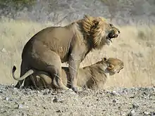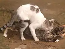 Lordosis behavior, also known as mammalian lordosis (Greek lordōsis, from lordos "bent backward"[1]) or presenting, is the naturally occurring body posture for sexual receptivity to copulation present in most mammals including rodents, elephants, and cats. The primary characteristics of the behavior are a lowering of the forelimbs but with the rear limbs extended and hips raised, ventral arching of the spine and a raising, or sideward displacement, of the tail. During lordosis, the spine curves dorsoventrally so that its apex points towards the abdomen.