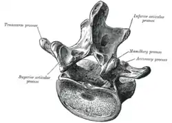 Three portions or tubercles can be noticed in a transverse process of a lower lumbar vertebrae: the lateral or costiform process, the mammillary process, and the accessory process.[2] The costiform is lateral, the mammillary is superior (cranial), and the accessory is inferior (caudal). The mammillary is connected in the lumbar region with the back part of the superior articular process. The accessory process is situated at the back part of the base of the transverse process. The tallest and thickest costiform process is usually that of L5.[2]