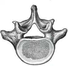 The vertebral body of each lumbar vertebra is kidney shaped, wider from side to side than from front to back, and a little thicker in front than in back. It is flattened or slightly concave above and below, concave behind, and deeply constricted in front and at the sides.[1]