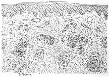 Lupus vulgaris (also known as tuberculosis luposa[1]) are painful cutaneous tuberculosis skin lesions with nodular appearance, most often on the face around the nose, eyelids, lips, cheeks, ears[2] and neck. It is the most common Mycobacterium tuberculosis skin infection.[3] The lesions may ultimately develop into disfiguring skin ulcers if left untreated.