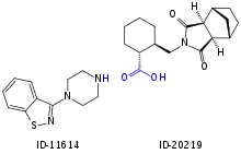 Main metabolism pathways are oxidative N-dealkylation between the piperazine and cyclohexane rings, hydroxylation of the norbornane ring, and S-oxidation.[5][53]:59 Other pathways are hydroxylation of the cyclohexane ring and reductive cleavage of the isothiazole ring followed by S-methylation.[52] The two relevant active metabolites are the norbornane hydroxylation products called ID-14283 and ID-14326, the former reaching pharmacologically relevant blood plasma concentrations. The two major inactive metabolites are the N-dealkylation products (the carboxylic acid ID-20219 and the piperazine ID-11614[52]), and a norbornane hydroxylated derivative of ID-20219 (ID-20220). Of lurasidone and its metabolites circulating in the blood, the native drug makes up 11%, the main active metabolite 4%, and the inactive carboxylic acids 24% and 11%, respectively.[4][5] Several dozen metabolites have been identified altogether.[53]:59–61