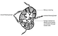 The lymph nodes, the spleen and Peyer's patches, are known as secondary lymphoid organs. Lymph nodes are found between lymphatic ducts and blood vessels. Afferent lymphatic vessels bring lymph fluid from the peripheral tissues to the lymph nodes.[4] The lymph tissue in the lymph nodes consists of immune cells (95%), for example lymphocytes, and stromal cells (1% to 5%)[5] The genesis of lymph nodes begins within the blood and the lymphatic system.[4] Interactions between stromal and hematopoietic cells are important for the development of lymph nodes. Crosstalk LEC, lymphoid tissue inducer cells and mesenchymal stromal organizer cells initiate the formation of lymph nodes.[1]