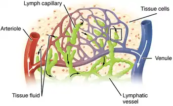 The tissues of the lymphatic system are responsible for maintaining the balance of the body fluids. Its network of capillaries and collecting lymphatic vessels work to efficiently drain and transport extravasated fluid, along with proteins and antigens, back to the circulatory system. Numerous intraluminal valves in the vessels ensure a unidirectional flow of lymph without reflux.[29] Two valve systems, a primary and a secondary valve system, are used to achieve this unidirectional flow.[30] The capillaries are blind-ended, and the valves at the ends of capillaries use specialised junctions together with anchoring filaments to allow a unidirectional flow to the primary vessels. The collecting lymphatics, however, act to propel the lymph by the combined actions of the intraluminal valves and lymphatic muscle cells.[31]