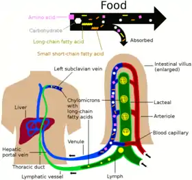 Nutrients in food are absorbed via intestinal vili (greatly enlarged in the picture) to blood and lymph. Long-chain fatty acids (and other lipids with similar fat solubility like some medicines) are absorbed to the lymph and move in it enveloped inside chylomicrons. They move via the thoracic duct of the lymphatic system and finally enter the blood via the left subclavian vein, thus bypassing the liver's first-pass metabolism completely.