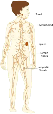 The lymphatic system, or lymphoid system, is an organ system in vertebrates that is part of the circulatory system and the immune system. It is made up of a large network of lymph, lymphatic vessels, lymph nodes, lymphatic or lymphoid organs, and lymphoid tissues.[1][2] The vessels carry a clear fluid called lymph (the Latin word lympha refers to the deity of fresh water, "Lympha")[3] towards the heart.