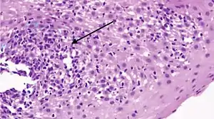 | Pathology image of lymphocytic esophagitis (H&E stain). The image demonstrates common findings in the condition: dense peripapillary lymphocytic infiltrate with spongiosis (arrow), and absence of neutrophils and eosinophils. | |
