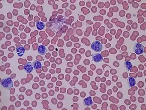 Lymphocytosis is an increase in the number or proportion of lymphocytes in the blood. Absolute lymphocytosis is the condition where there is an increase in the lymphocyte count beyond the normal range while relative lymphocytosis refers to the condition where the proportion of lymphocytes relative to white blood cell count is above the normal range. In adults, absolute lymphocytosis is present when the lymphocyte count is greater than 4000 per microliter (4.0 x 109/L), in older children greater than 7000 per microliter and in infants greater than 9000 per microliter.[1] Lymphocytes normally represent 20% to 40% of circulating white blood cells. When the percentage of lymphocytes exceeds 40%, it is recognized as relative lymphocytosis.