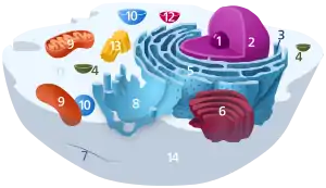 Lysosomes are known to contain more than 60 different enzymes, and have more than 50 membrane proteins.[7][8] Enzymes of the lysosomes are synthesised in the rough endoplasmic reticulum and exported to the Golgi apparatus upon recruitment by a complex composed of CLN6 and CLN8 proteins.[9][10] The enzymes are trafficked from the Golgi apparatus to lysosomes in small vesicles, which fuse with larger acidic vesicles. Enzymes destined for a lysosome are specifically tagged with the molecule mannose 6-phosphate, so that they are properly sorted into acidified vesicles.[11][12]