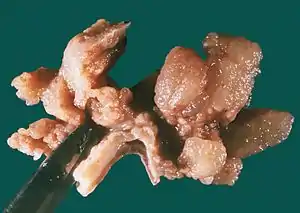 | Biopsy of the stomach in Ménétrier disease showing the substantial pit hyperplasia makes the large rugal folds appear to be covered by myriad polyps resembling hyperplastic polyps. The muscularis propria is the folded structure at the bottom center. | |