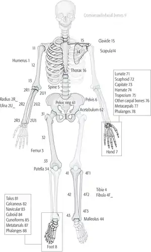 First, each fracture is given 2 numbers to describe which bone it affects, and where in the bone: