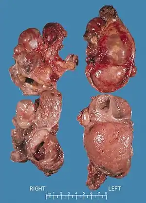 Multiple endocrine neoplasia type 2 (also known as "Pheochromocytoma and amyloid producing medullary thyroid carcinoma",[1] "PTC syndrome,"[1] and "Sipple syndrome"[1]) is a group of medical disorders associated with tumors of the endocrine system. The tumors may be benign or malignant (cancer). They generally occur in endocrine organs (e.g. thyroid, parathyroid, and adrenals), but may also occur in endocrine tissues of organs not classically thought of as endocrine.[2]