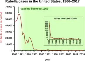 Before the widespread use of a vaccine against measles, rates of disease were so high that infection was felt to be "as inevitable as death and taxes."[20] Reported cases of measles in the United States fell from hundreds of thousands to tens of thousands per year following introduction of the vaccine in 1963. Increasing uptake of the vaccine following outbreaks in 1971, and 1977, brought this down to thousands of cases per year in the 1980s. An outbreak of almost 30,000 cases in 1990 led to a renewed push for vaccination and the addition of a second vaccine to the recommended schedule. Fewer than 200 cases have been reported in the U.S. each year between 1997 and 2013, and the disease is no longer considered endemic there.[21][22][23]