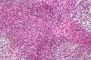 Micrograph of malignant peripheral nerve sheath tumour with the typical herringbone pattern. H&E stain.