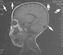 A wrap-around artifact also known as an aliasing artifact, is a result of mismapping of anatomy that lies outside the field of view but within the slice volume.[4] The selected field of view is smaller than the size of the imaged object. The anatomy is usually displaced to the opposite side of the image (Figs 6 and 7). It can be caused by non-linear gradients or by undersampling of the frequencies contained within the return signal.[1]