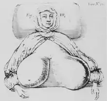 One early and extreme case study of gigantomastia dates to 1670. The patient died four months after the onset of enlargement. One breast removed after the woman's death weighed 29 kg (64 lb).[49]