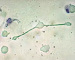A macrophage stretching its "arms" (filopodia)[1] to engulf two particles, possibly pathogens, in a mouse. Trypan blue exclusion staining.