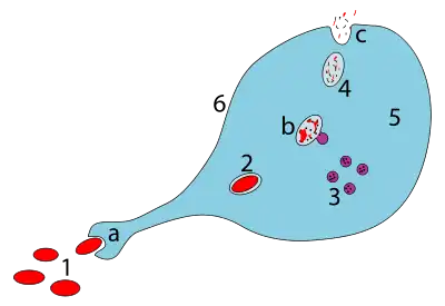 Macrophages (abbreviated as , or MP) (Greek: large eaters, from Greek μακρός (makrós) = large, φαγεῖν (phagein) = to eat) are a type of white blood cell of the immune system that engulfs and digests anything that does not have on its surface those proteins specific to healthy body cells, including cancer cells, microbes, cellular debris, foreign substances, etc.[2][3] The process is called phagocytosis, which acts to defend the host against infection and injury.[4]