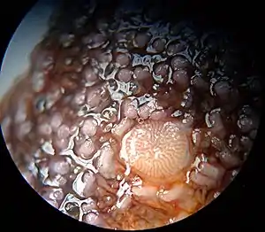 The madreporite /ˌmædrɪˈpɔːraɪt/[1] is a light colored calcareous opening used to filter water into the water vascular system of echinoderms. It acts like a pressure-equalizing valve. It is visible as a small red or yellow button-like structure, looking like a small wart, on the aboral surface of the central disk of a sea star or sea urchin. Close up, it is visibly structured, resembling a "madrepore" (stone coral, Scleractinia) colony. From this, it derives its name.
