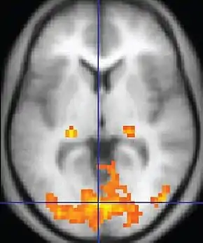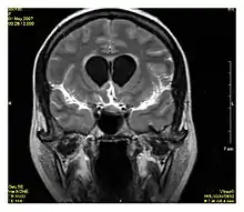 MRI is the investigative tool of choice for neurological cancers over CT, as it offers better visualization of the posterior cranial fossa, containing the brainstem and the cerebellum. The contrast provided between grey and white matter makes MRI the best choice for many conditions of the central nervous system, including demyelinating diseases, dementia, cerebrovascular disease, infectious diseases, Alzheimer's disease and epilepsy.[20][21][22] Since many images are taken milliseconds apart, it shows how the brain responds to different stimuli, enabling researchers to study both the functional and structural brain abnormalities in psychological disorders.[23] MRI also is used in guided stereotactic surgery and radiosurgery for treatment of intracranial tumors, arteriovenous malformations, and other surgically treatable conditions using a device known as the N-localizer.[24][25][26]