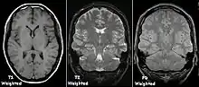 An MRI sequence is a particular setting of radiofrequency pulses and gradients, resulting in a particular image appearance.[47] The T1 and T2 weighting can also be described as MRI sequences.