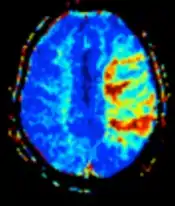 Perfusion weighted (PWI) Dynamic susceptibility contrastDSCGadolinium contrast is injected, and rapid repeated imaging (generally gradient-echo echo-planar T2 weighted) quantifies susceptibility-induced signal loss.[65] In cerebral infarction, the infarcted core and the penumbra have decreased perfusion (pictured).[66]