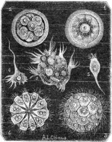 | Image from "La Nature - Revue des Sciences", 1879: 1. Ovular phase of the Magosphere - 2. Segmentation of the egg inside the cyst. - 3. An adult magosphere whose surface is at the focus of the microscope. - 4. The same one, whose equatorial plane is placed at the microscope's focus to show the internal disposition of the cells. - 5, 6, 7: Cells of the Magosphere after their isolation, taking various amoeboid forms before encysting to become an egg. | |