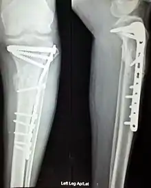 | Complications | Osteoarthritis, peroneal nerve palsy |