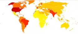 The most common time of onset is in a person's 20s and 30s,[3][4] with females affected about twice as often as males.[3][4] Major depressive disorder affected approximately 163 million people (2% of the world's population) in 2017.[6] The percentage of people who are affected at one point in their life varies from 7% in Japan to 21% in France.[4] Lifetime rates are higher in the developed world (15%) compared to the developing world (11%).[4] The disorder causes the second-most years lived with disability, after lower back pain.[12]