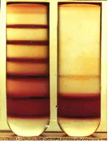 To achieve synchronization and/or concentration of the parasites in culture several methods have been developed. A discontinuous Percoll gradient procedure can be used to isolate infected red blood cells because red cells containing plasmodia are less dense than normal ones. Young trophozoites coincided with erythrocytes in a broad band corresponding to densities from 1.075 to 1.100 g/ml, whereas schizonts were concentrated at a density approximating 1.062 g/ml.[14] There are studies, however, that suggest that some strains of P.falciparum are affected in their capacity of invasion after being exposed to this chemical. The difference between diamagnetic low-spin oxyhemoglobin in uninfected red blood cells and paramagnetic hemozoin in infected red blood cells can also be used for isolation. Magnetic columns have shown to be less harmful for the parasite and are simple and adjustable to the needs of the researcher.[15][16] The column is mounted in a potent magnet holder and the culture flowed through it. The column traps the erythrocytes infected with the latest stages of the parasites, which can then be eluted when the column is removed from the magnet. It is a simple method that does not need expensive equipment and it does not seem to affect the parasites as to their invasion capabilities afterwards.[12]