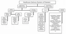 The healthcare delivery system of Pakistan (تحفّظ صحتِ عامّہ ، پاکستان) is complex because it includes healthcare subsystems by federal governments and provincial governments competing with formal and informal private sector healthcare systems.[3][2] Healthcare is delivered mainly through vertically managed disease-specific mechanisms. The different institutions that are responsible for this include: provincial and district health departments, parastatal organizations, social security institutions, non-governmental organizations (NGOs) and private sector.[4] The country's health sector is also marked by urban-rural disparities in healthcare delivery and an imbalance in the health workforce, with insufficient health managers, nurses, paramedics and skilled birth attendants in the peripheral areas.[5][6] Pakistan's gross national income per capita in 2013 was $5,041 and the total expenditure on health per capita in 2014 was $129, constituting 2.6% of the country's GDP.[7]