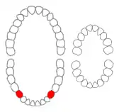 ![]() Mandibular first premolars of permanent teeth marked in red. There are no premolars in primary teeth. | |