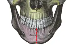 Anterior view of mandible, showing mandibular symphysis (red broken line)