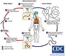 The third-stage larvae migrate to the midge's proboscis, where they can infect another human when the midge takes a blood meal.[5]
