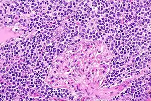Primary salivary gland EMZL (also termed MALT lymphoma of the salivary glands) or, in cases primarily involving the lacrimal glands, primary lacrimal gland EMZL (also termed MALT lymphoma of the lacrimal gland) is a complication of Sjögren syndrome, an autoimmune disease characterized by chronic inflammation of the salivary and/or lacrimal glands.[17] This autoimmune disease is thought to be caused by a combination of genetic and environmental factors including infectious agents. This lymphoma afflicts ~3% of patients with Sjögren syndrome[8] and involves one or more of the afflicted salivary or, less commonly, lacrimal glands.[17] The median time between diagnosis of the autoimmune disease and EMZL varies between 7.5[17] and 11 years.[19] Afflicted individuals typically are 55–60 years old and present with localized hardening and/or enlargement of the parotid gland or, less commonly, other salivary or lacrimal gland. Some 20% of cases present with or progress to involve local lymph nodes or the spleen to cause lymphadenopathy or splenomegaly while ~10% of cases present with or progress to a high-grade lymphoma, primarily diffuse large B-cell lymphoma.[17] Histologically, the involved glands show lymphocyte-based lesions that are typical of EMZL with the infiltrating lymphocytes in some cases having morphological features resembling plasma cells. In individuals with more advanced disease, these lesions develop in the mucosal linings of the eye socket, nasal cavity, pharynx, airways of the lower respiratory tract, stomach, and/or thyroid gland.[8]