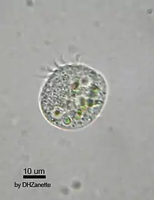 A single-celled ciliate with green zoochlorellae living inside endosymbiotically