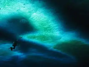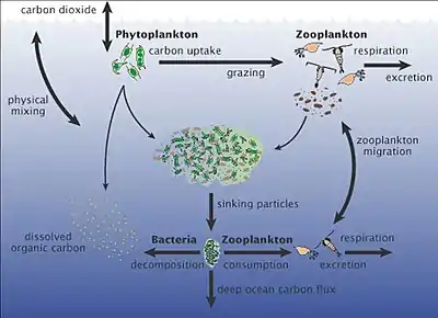 Microscopic life undersea is diverse and still poorly understood, such as for the role of viruses in marine ecosystems.[14] Most marine viruses are bacteriophages, which are harmless to plants and animals, but are essential to the regulation of saltwater and freshwater ecosystems.[15] They infect and destroy bacteria in aquatic microbial communities, and are the most important mechanism of recycling carbon in the marine environment. The organic molecules released from the dead bacterial cells stimulate fresh bacterial and algal growth.[16] Viral activity may also contribute to the biological pump, the process whereby carbon is sequestered in the deep ocean.[17]
