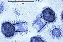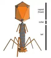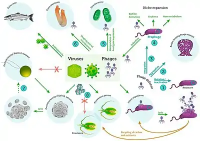Bacteriophages, often just called phages, are viruses that parasite bacteria and archaea. Marine phages parasite marine bacteria and archaea, such as cyanobacteria.[41] They are a common and diverse group of viruses and are the most abundant biological entity in marine environments, because their hosts, bacteria, are typically the numerically dominant cellular life in the sea. Generally there are about 1 million to 10 million viruses in each mL of seawater, or about ten times more double-stranded DNA viruses than there are cellular organisms,[42][43] although estimates of viral abundance in seawater can vary over a wide range.[44][45] For a long time, tailed phages of the order Caudovirales seemed to dominate marine ecosystems in number and diversity of organisms.[41] However, as a result of more resent research, non-tailed viruses appear to be dominant in multiple depths and oceanic regions, followed by the Caudovirales families of myoviruses, podoviruses, and siphoviruses.[46] Phages belonging to the families Corticoviridae,[47] Inoviridae,[48] Microviridae,[49] and Autolykiviridae[50][51][52][53] are also known to infect diverse marine bacteria.