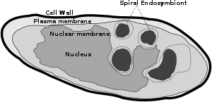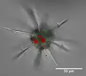 Protists are highly diverse organisms currently organised into 18 phyla, but are not easy to classify.[92][93] Studies have shown high protist diversity exists in oceans, deep sea-vents and river sediments, suggesting a large number of eukaryotic microbial communities have yet to be discovered.[94][95] There has been little research on mixotrophic protists, but recent studies in marine environments found mixotrophic protests contribute a significant part of the protist biomass.[90] Since protists are eukaryotes they possess within their cell at least one nucleus, as well as organelles such as mitochondria and Golgi bodies. Protists are asexual but can reproduce rapidly through mitosis or by fragmentation.