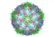 Chaetoceros tenuissimus RNA virus 01, genus Bacillarnavirus: The MCPs are coloured in green, magenta and cyan and the mCP in yellow.