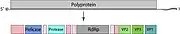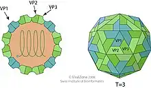 Virions in Marnaviridae are non-enveloped, with icosahedral geometries, and T=pseudo3 symmetry. The diameter is around 25 nm. Genomes are linear and non-segmented (monopartit), around 8.6 kb in length.[8] The capsid consists of three major capsid proteins (MCPs: VP1, VP2, VP3), each having a Jelly roll fold and a minor capsid protein (mCP) that is located around the five-fold axes on the inside of the capsid. [9]
