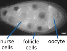 A Drosophila melanogaster oocyte develops in an egg chamber in close association with a set of cells called nurse cells. Both the oocyte and the nurse cells are descended from a single germline stem cell, however cytokinesis is incomplete in these cell divisions, and the cytoplasm of the nurse cells and the oocyte is connected by structures known as ring canals.[5] Only the oocyte undergoes meiosis and contributes DNA to the next generation.