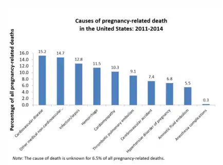 - Creanga AA, Syverson C, Seed K, Callaghan WM (August 2017). "Pregnancy-Related Mortality in the United States, 2011-2013". Obstetrics and Gynecology. 130 (2): 366–373. doi:10.1097/AOG.0000000000002114. PMC 5744583. PMID 28697109.