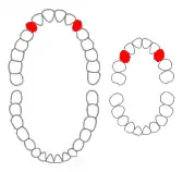 ![]() Maxillary canines of permanent and primary teeth marked in red. | |
