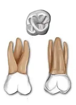 - The mesiobuccal root is broad distobuccal and has prominent depressions or flutings on its mesial and distal surfaces. The internal canal morphology is highly variable, but the majority of the mesiobuccal roots contain two canals.