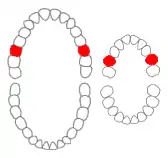 ![]() Maxillary first molars of permanent and primary teeth marked in red. | |