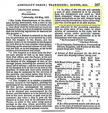 The Sick Berth Branch of the Royal Navy originated on May 4, 1833 when an Admiralty order was issued to Commanding Officers to organise a "Sick Berth Attendant" in ships of the 5th rate and upwards a man of good character is to be selected from the complement and rated as Sick Berth attendant, whose duty it will be to attend exclusively on the sick, without being called away by the ordinary duties of the ship, and who is to be paid as an able seaman.[3][4]