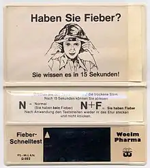 The thermometer is applied to the patient's brow. It is typically a band coated with different temperature-sensitive markings using plastic strip thermometer or similar technology; at a given temperature the markings (numerals indicating the temperature) in one region are at the right temperature to become visible. This type may give an indication of fever, but is not considered accurate.[20]
