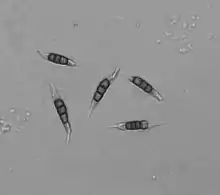 40x brightfield microscopy of Pestalotia/Pestalotiopsis spores. Note the appendages. Some strains (Pestalotiopsis pauciseta) produce taxol.[4][5]