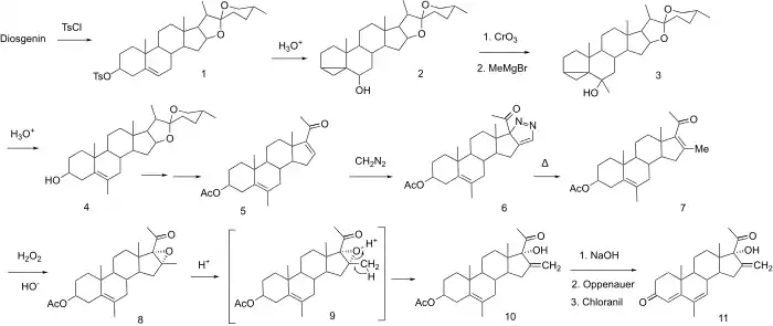 Substitution at the 16 position was found to lead to further potentiation of progestational activity. Reaction with diazomethane at the conjugated double bond at 16 gives first the pyrazole (6). This heterocycle affords the 16 methyl enone on pyrolysis (7). Selective epoxidation of the conjugated double bond to the 16,17α-epoxide over that at 5,6 is achieved by oxidation with basic hydrogen peroxide (8). Opening of this tetrasubstituted oxirane ring in acid proceeds with loss of a proton from the β position (16 methyl) (9) to afford the desired 16-methylene-17α-hydroxy-20-ketone functionality in the D ring (10). The product is saponified and then the subject of an Oppenauer oxidation, which is then dehydrogenated to the 4,6-diene with chloranil (11). Acetylation under forcing conditions completes the synthesis of melengesterol acetate.